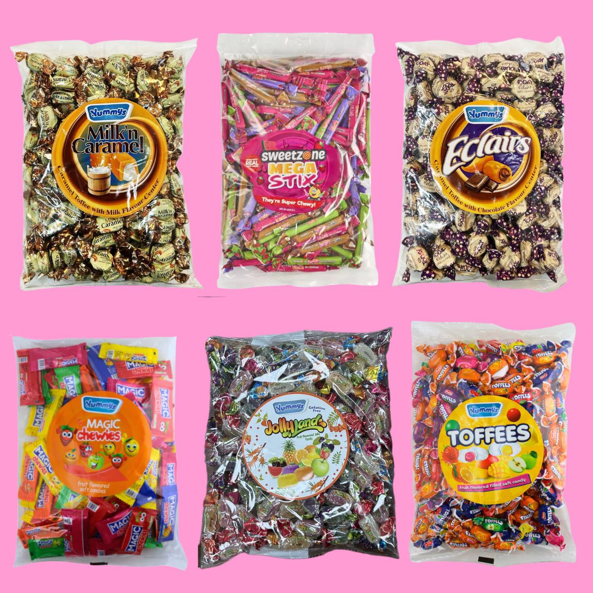 | 6 Bags for £40! - Milk n Caramel, Magic Stix, Eclairs, Magic Chews, Jollyland, Toffees Candy Sweet Bags |